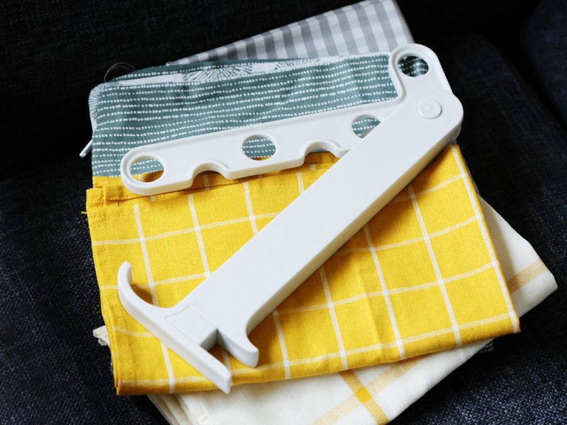 カーテンレールで部屋干しを行う補助具です。4連フックになって、収納式でコンパクトに使用できます。レール部にあたる箇所には磁石を内蔵し、レールに固定しやすくなっています。使用しながらカーテンの開閉も可能。